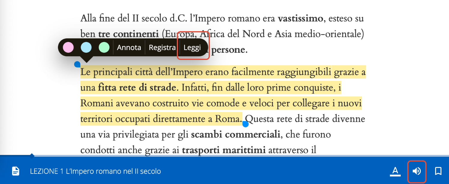 È possibile attivare la lettura vocale dell'intero testo, oppure di una parte selezionata.